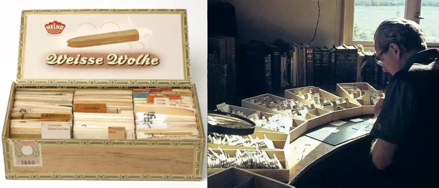 Dazu passen auch seine berühmten Arno-Schmidt-Zettelkästen, die ja längst als geflügeltes Wort in den deutschen Sprachgebrauch eingezogen sind.