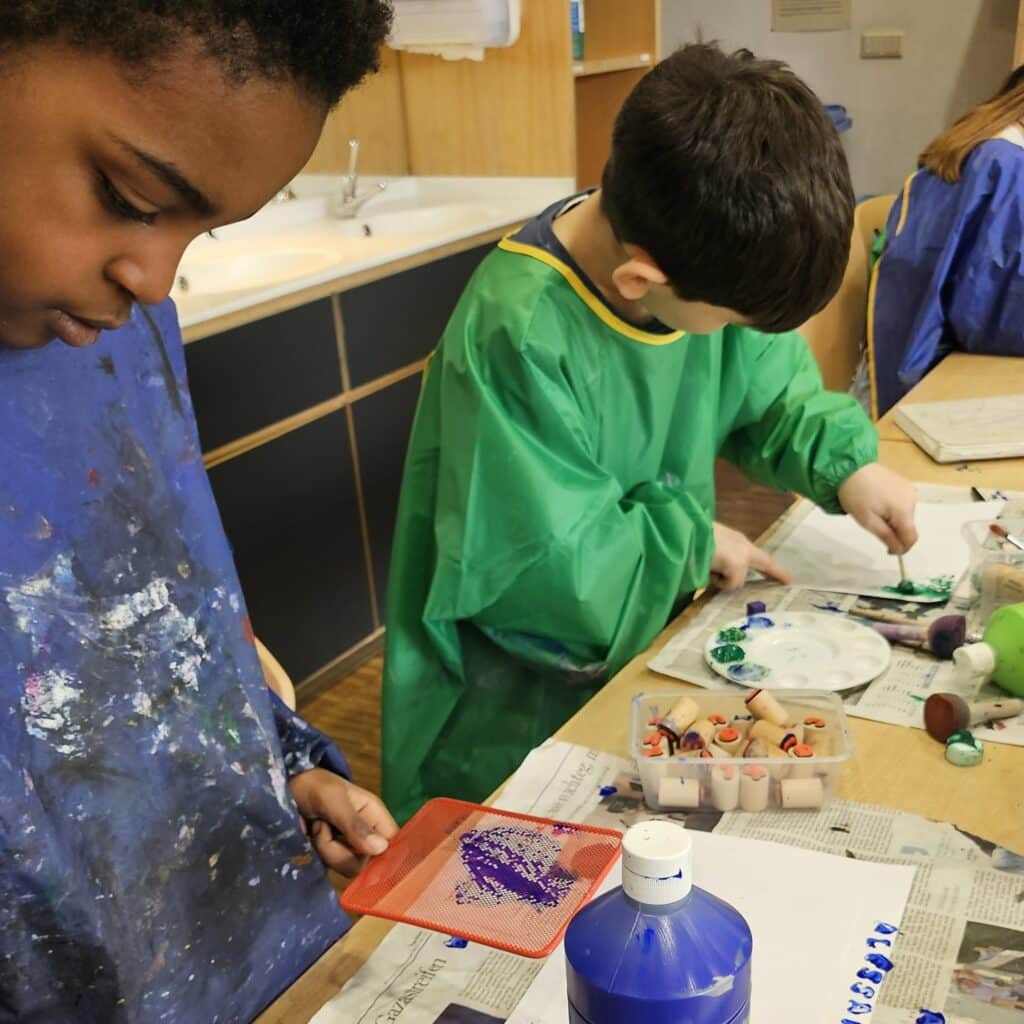 So entstand die Idee, in der Freizeit eigenes Briefpapier zu gestalten. Die Kinder hatten die Möglichkeit, Briefpapier mithilfe verschiedener Techniken zu entwickeln. Nachdem sie in ihrem Skizzenblock zunächst eine Skizze entworfen hatten, konnten sie mit der Umsetzung beginnen. Der Kreativität der Kinder waren dabei keine Grenzen gesetzt, und sie konnten ihr Briefpapier individuell gestalten.