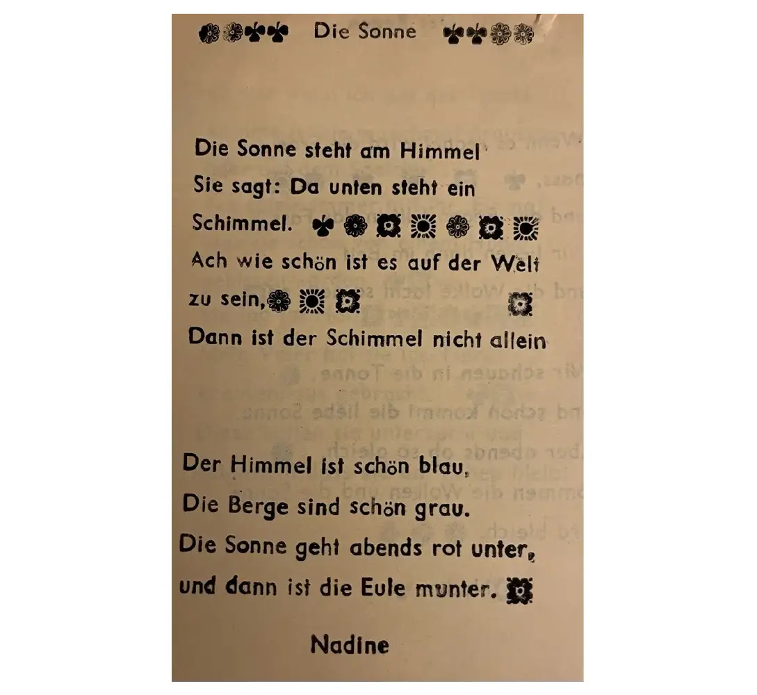 – das spiegelverkehrte Setzen der Wörter und Sätze in den Setzrahmen; die Kinder der Klasse des Alten haben dabei keinen Spiegel benutzt!; der Gewinn für die Praxis des Lesens und Schreibens durch diese Komplexität und Plastizität der Denkhandlungen verblüfft den Alten bis heute)