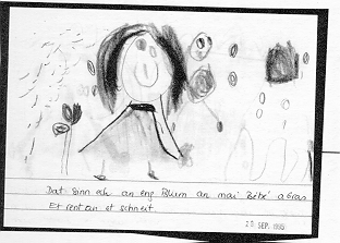 Joffer schreift op a seet derbäi: an de Laurent. (Duerch hiert Matschwätzen strukturéiert d'Joffer d'Schrëftsprooch.) A wat maachen déi dann all?
