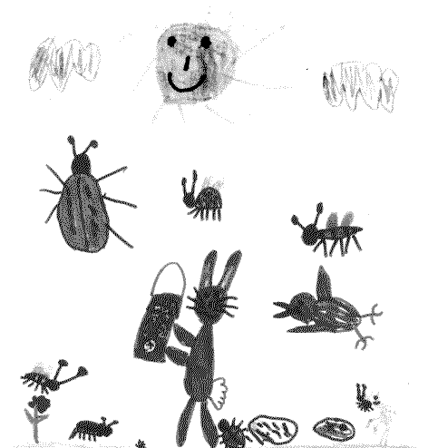 Lilli, 28.3.: ... Der Osterhase fängt eine Fliege und gibt der Heuschrecke die Fliege zum essen. Die Wespe fliegt auf eine Rose. Die Kreuzspinne geht auf sein Spinnennetz ...