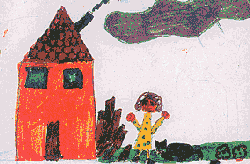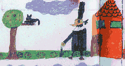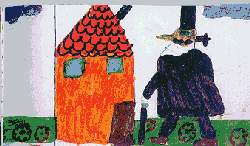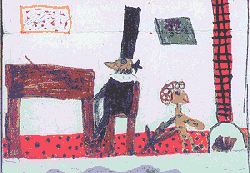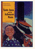 "Also, gute Frau" sagt der Schwarze Mann von draußen, "Sie wissen doch, dass das keinen Sinn hat. Verriegeln Sie nur Türen und Fenster, dann komm ich eben durch den Kamin. Und wenn Sie den Kamin verschließen, dann komme ich eben durch Mauerritzen. Sie können genausogut gleich die Tür aufmachen und mich reinlassen." Der Schwarze Mann klopft weiter an die Tür. Früher oder später, das weiß er, wird Tante Anna aufgeben und ihn reinlassen. Tante Anna ist das schon klar, aber auf den Kopf gefallen ist sie auch nicht. Als der Schwarze Mann wieder klopft, zwinkert sie ihrem Kater Rudi zu, öffnet die Tür weit und ruft: "Kommen Sie nur!" Der Schwarze Mann stolziert zur Tür herein. |
