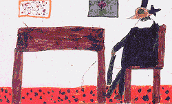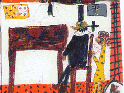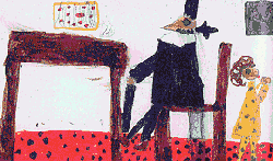 Und da stand der Schwarze Mann. Er trug einen langen schwarzen Mantel, eine hohen schwarzen Hut und glänzend schwarze Schuhe. Er hatte einen schwarzen Stock mit Silberknauf in der Hand, und seine spitzen weißen Zähne glänzten in seinem spitzen schwarzen Bart. |