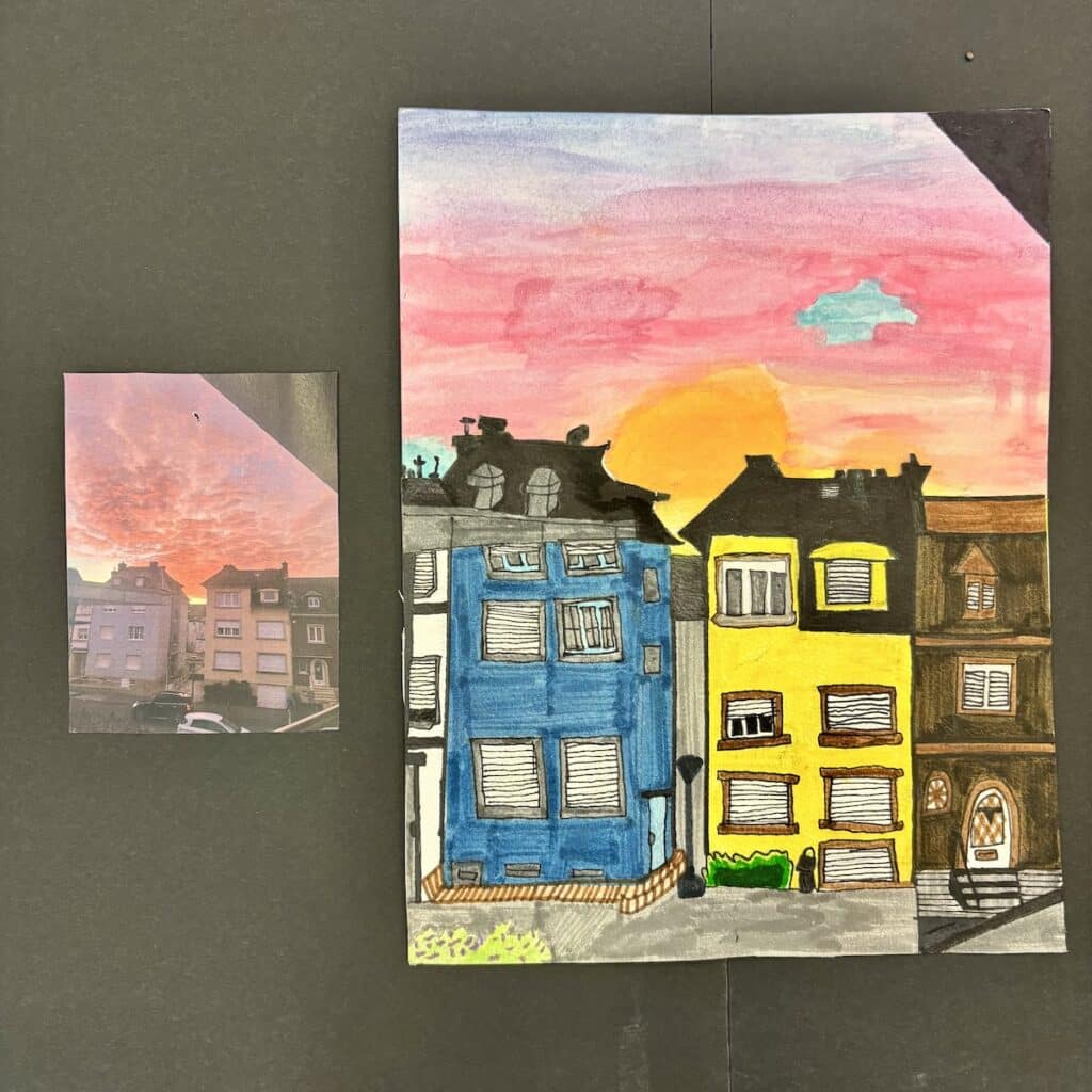 Ich habe ein Foto des Himmels gemacht. Einmal saßen wir im Kreis und dann hat Beatriz gesagt: „Oh, schau wie schön! Darf ich ein Foto machen Marie?“ Wir haben das Foto gemacht, weil der Himmel sehr schön war. Anschließend habe ich ein Bild mit verschiedenen Farben gemalt: rosa, rot, blau, gelb, orange und grün.