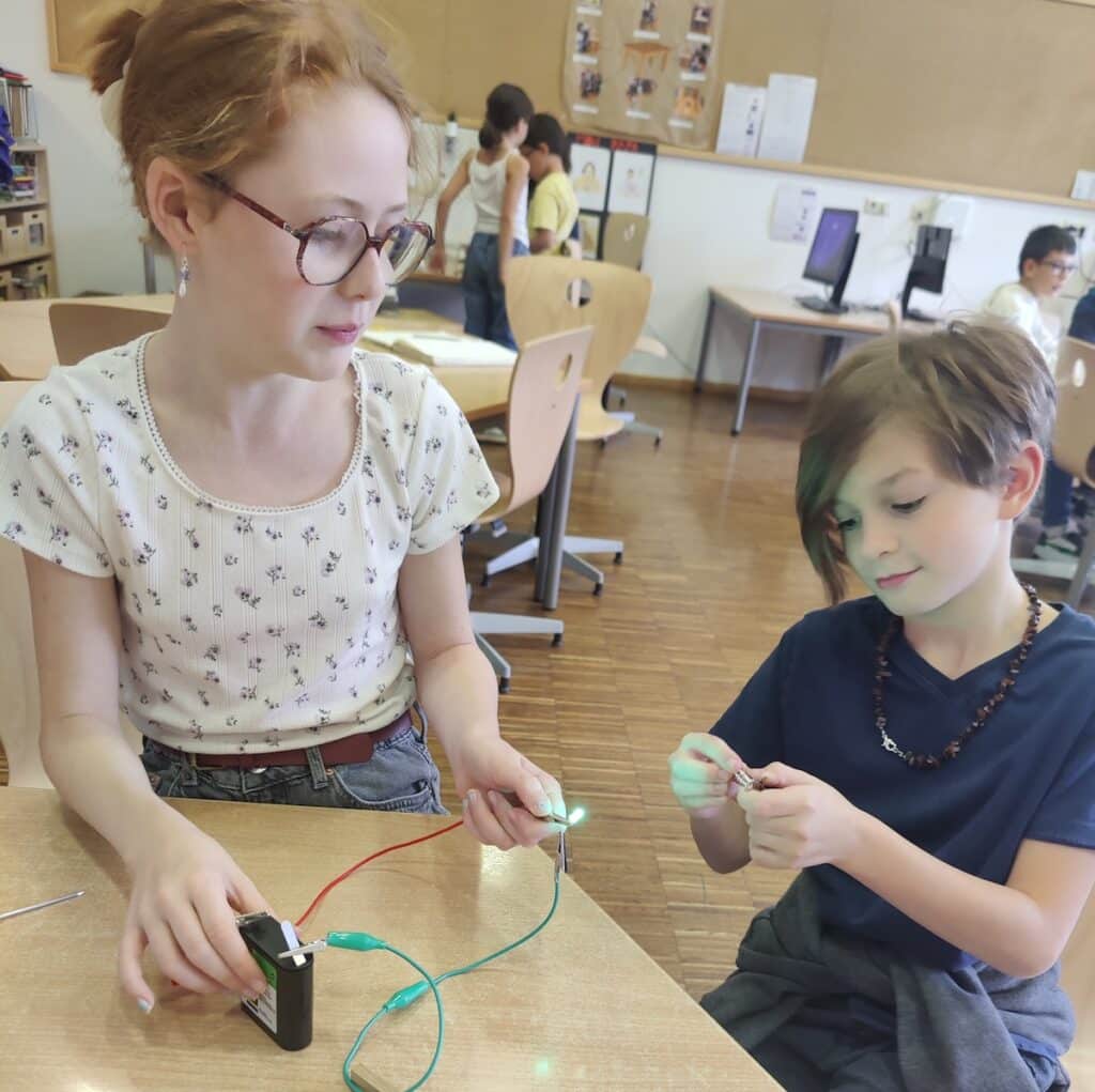 Anhand kleiner Experimente und mithilfe des Skizzenblocks gestalten die Kinder ihren ersten einfachen Stromkreis. Dabei halten sie ihre Beobachtungen fest und entwickeln erste eigene Erklärungen dafür, wie Strom fließt und warum die Glühbirne leuchtet, oder eben nicht. Die Kinder lernen voneinander und miteinander und werden dabei begleitet. Hierbei spielen ihre eigenen Ideen, Interessen, sowie ihr Vorwissen eine wichtige Rolle.
