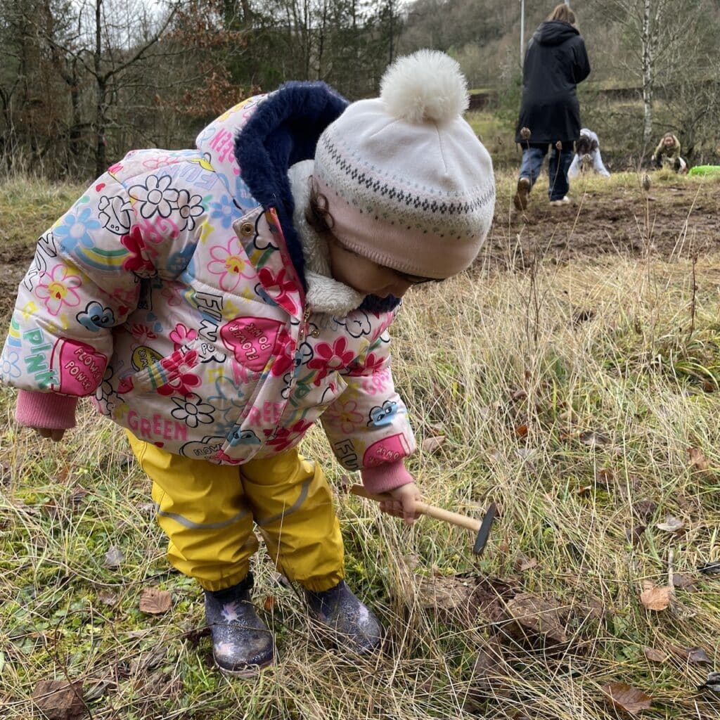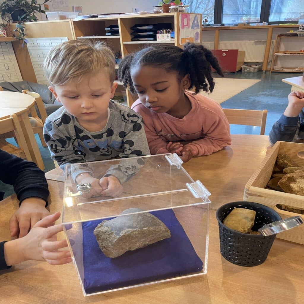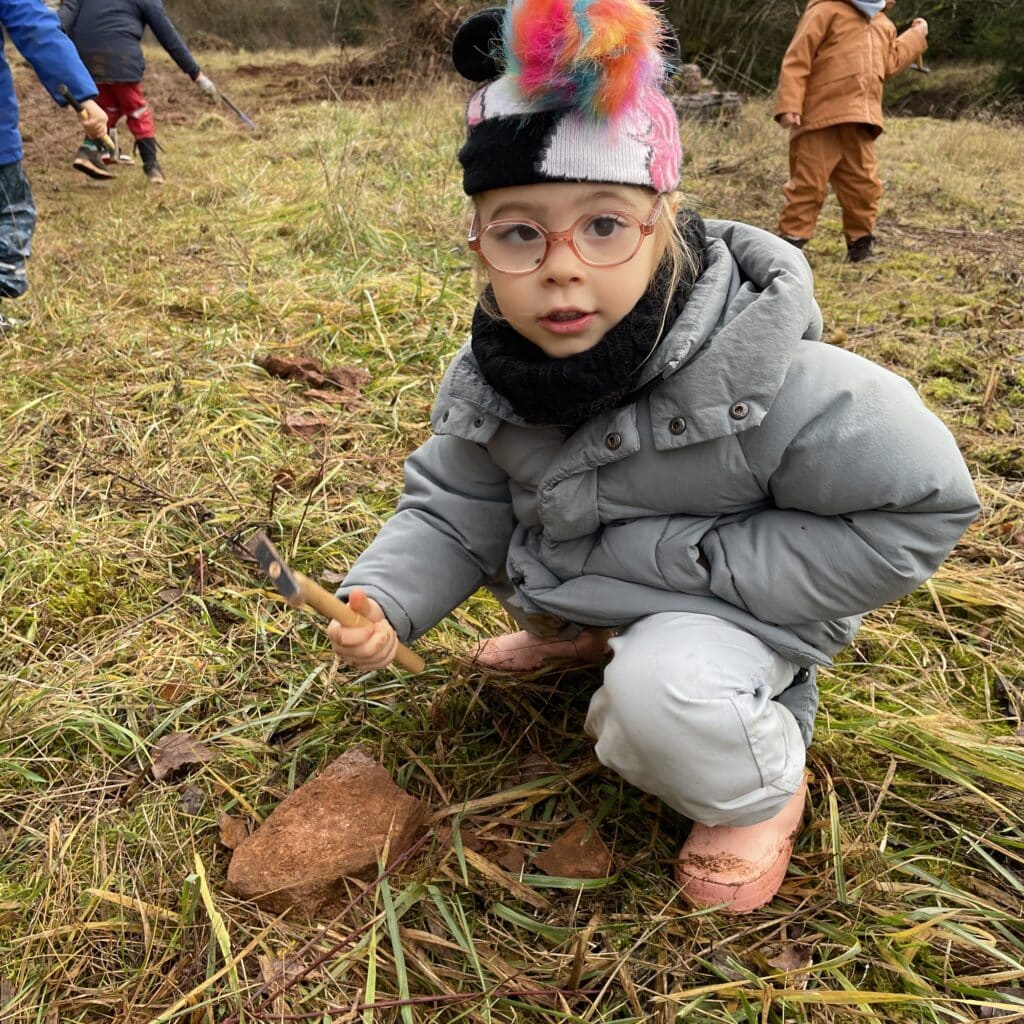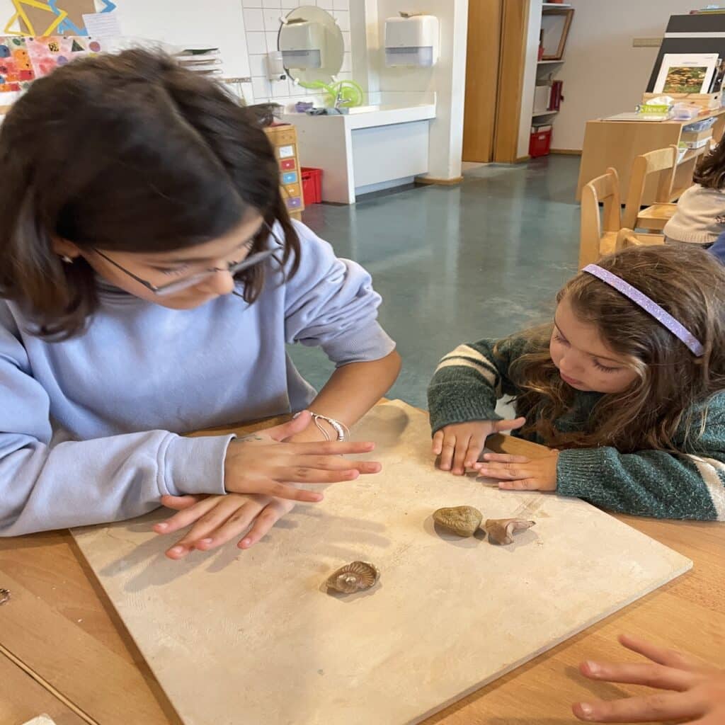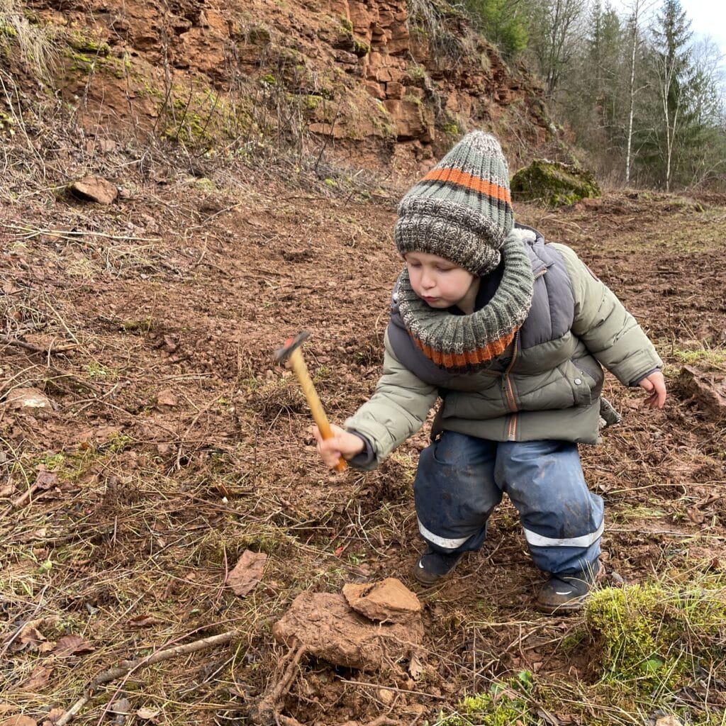 „Wir haben mit den großen Kindern etwas gepflanzt und wir haben im Garten gearbeitet. Die großen Kinder haben uns geholfen und wir haben Liams Fossilie angeschaut. Wir waren auch Fossilien suchen. Wir haben mit dem Hammer geschlagen und Muscheln gesucht. Wir haben sogar Fossilien gefunden.“ (Keno)