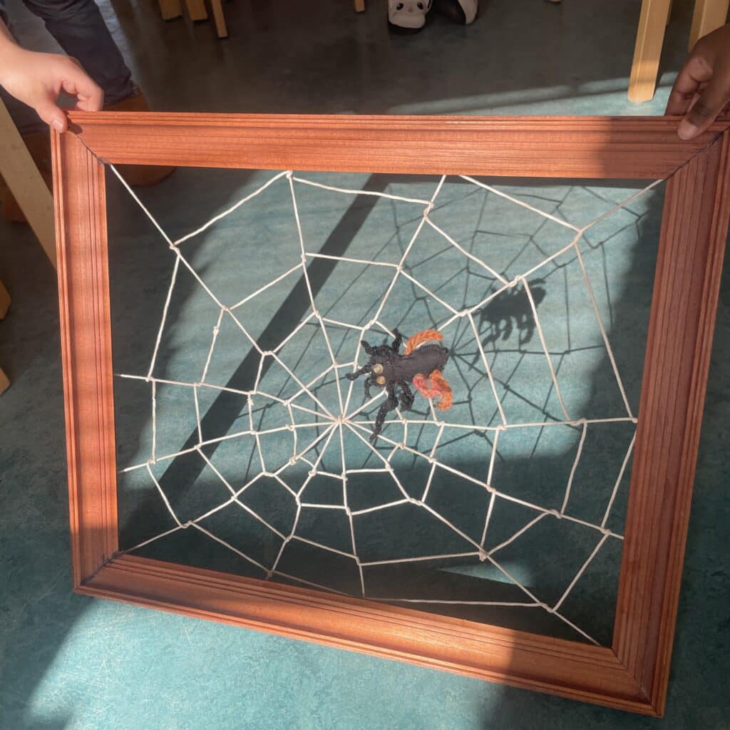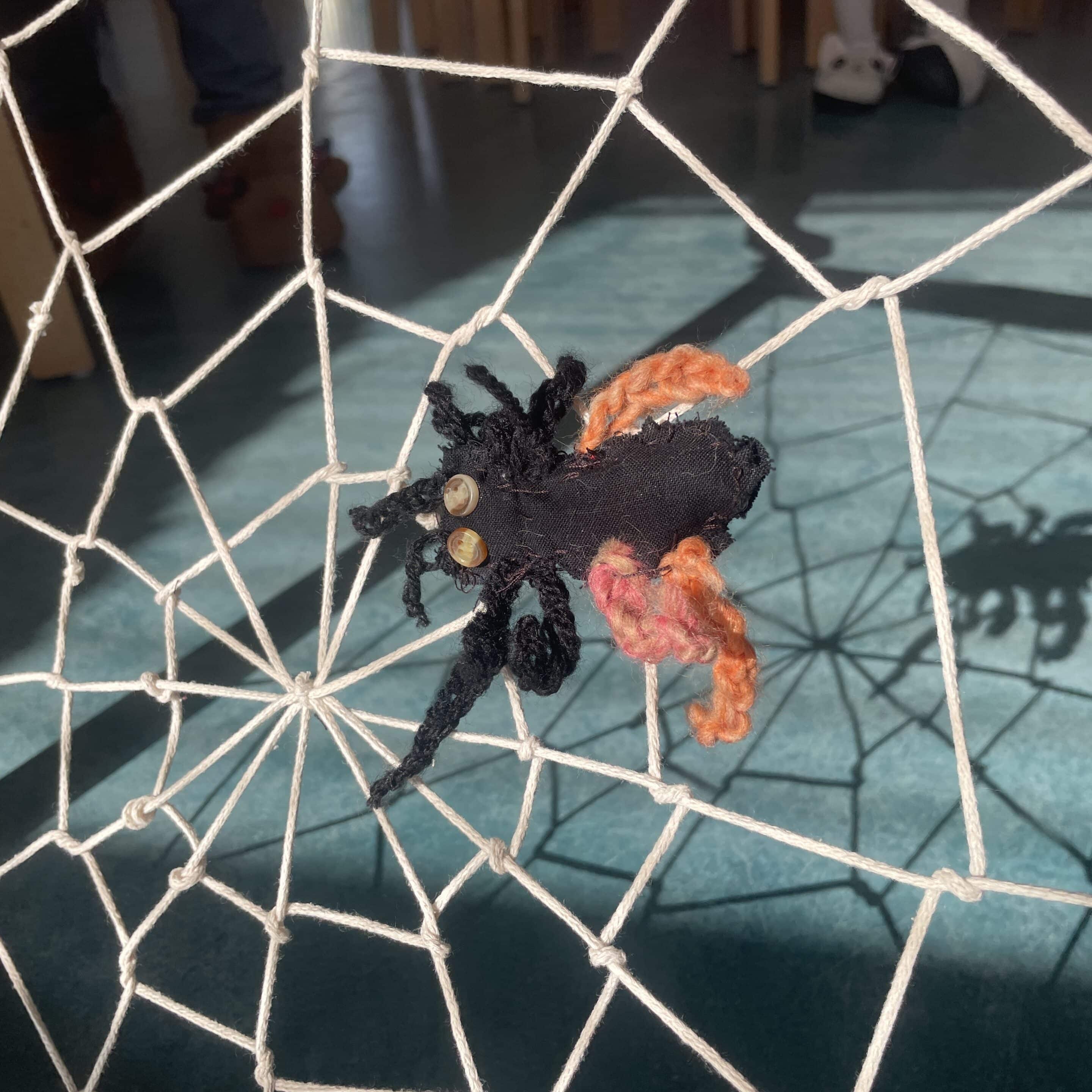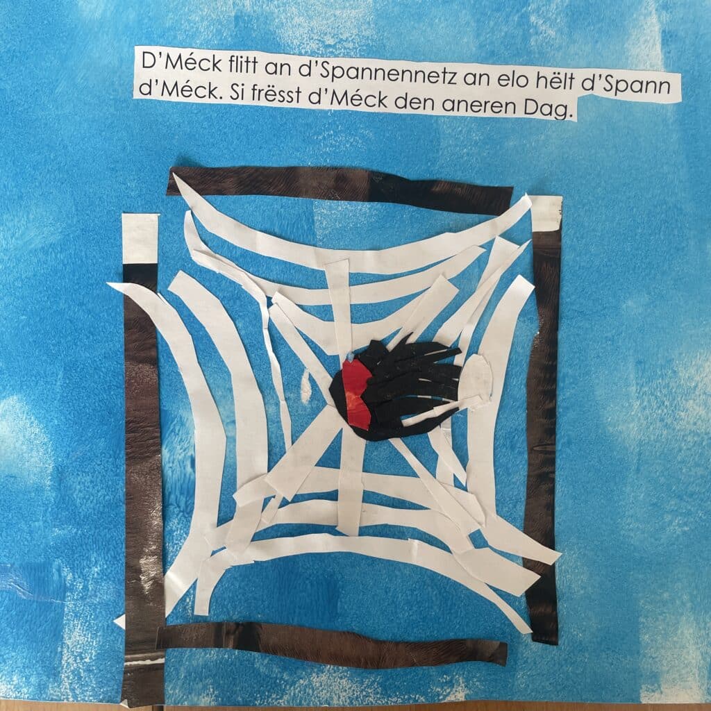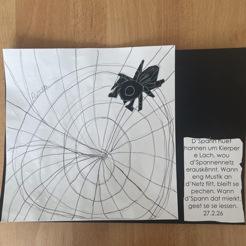 „Ich habe zu Hause eine Spinne gesehen. Ihre Augen waren ganz schwarz. Ich habe sie mit in die Schule genommen. Da haben wir sie angeschaut. Ich habe eine Collage von der Spinne in ihrem Netz gemacht. Wir haben auch ein Video von der Spinne angeschaut. Wir haben mit weißer Wolle das Spinnennetz in einem Bilderrahmen gespannt. Wir haben die Beine der Spinne gehäkelt und sie an den Körper genäht. Ich mag Spinnen, weil ich fürchte sie nicht und ich finde sie cool.“ – Daniel