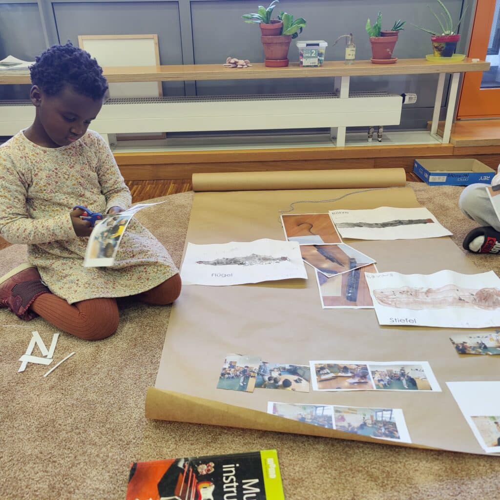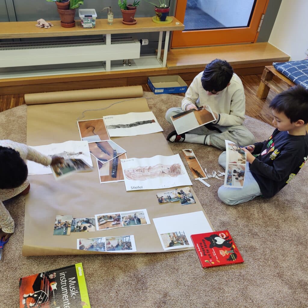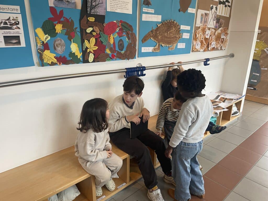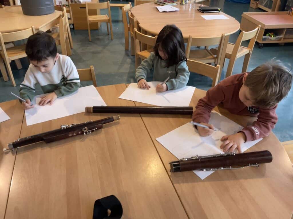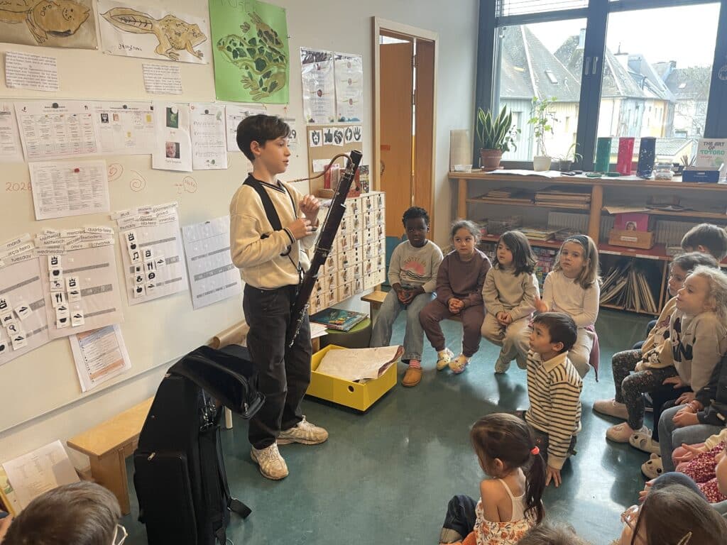 Im Musikunterricht (C1) stellte Eliott (C3) sein Instrument vor, das er seit über zwei Jahren spielt. Die Kinder des Cycle 1 verfolgten aufmerksam, wie Eliott sein Fagott Schritt für Schritt zusammenbaute und dabei die einzelnen Bestandteile sowie die Entstehung des Klangs anschaulich erklärte. Im Anschluss setzten sich die Kinder intensiv mit dem Instrument auseinander, indem sie die verschiedenen Einzelteile zeichneten und den Aufbau sowie die Klangerzeugung genauer untersuchten. Eliott begleitete sie dabei, unterstützte ihre Beobachtungen und half ihnen, ihre Feststellungen gemeinsam zu verschriftlichen. Im Anschluss gingen Pina und Romeo in den Cycle 3, um dort gemeinsam mit Eliott ein Display mit ihren Zeichnungen, Fotos und Texten zu gestalten und die Arbeitsergebnisse sichtbar zu machen.