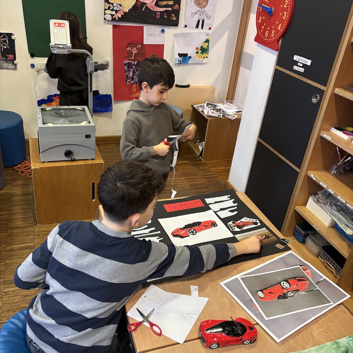 « J’ai travaillé pendant quelques semaines avec Johann sur son projet de Ferrari. On a effectué des recherches ensemble et on a fait une affiche ensemble. J’ai beaucoup aimé travailler avec Johann parce que moi aussi j’aime les voitures et ça m’a fait beaucoup plaisir de l’aider. »