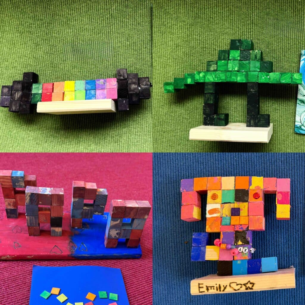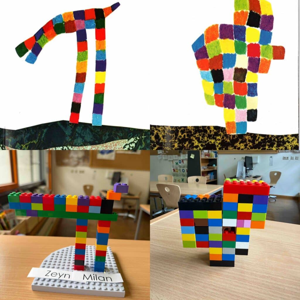 Pour la fête des pères, ils ont assemblé des cubes pour réaliser une sculpture unique, développant ainsi leur créativité et leur compréhension des structures solides. En mathématiques, ils ont reproduit les personnages du livre avec des Lego, travaillant leur observation, leur logique et leur manipulation d’objets concrets.