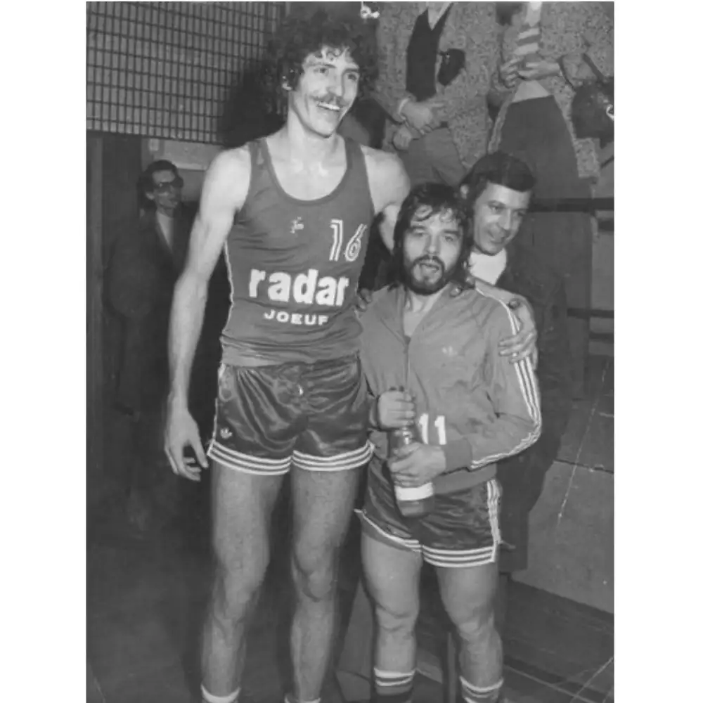 (Diese Spiele hatten es in sich, stes ein aussichtsloser Kampf der Underdogs aus dem Hüttengebiet gegen die reicheren Spitzenklubs aus Villeurbanne, Le Mans, Berck, … hier illustriert durch Joeufs Spielmacher Jean-Louis Tornior, 1m64, zu sehen auf dem Bild mit seinem Spielertrainer George Fisher: