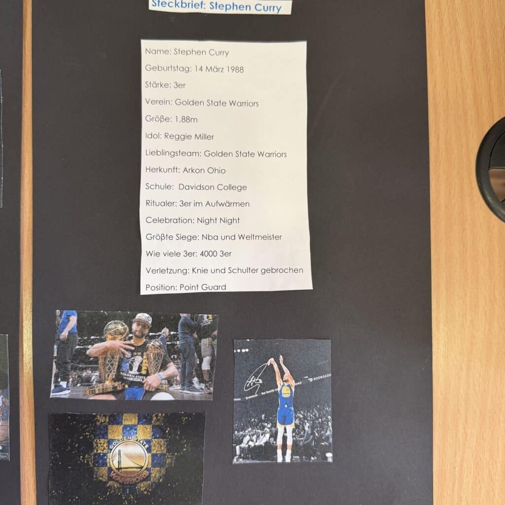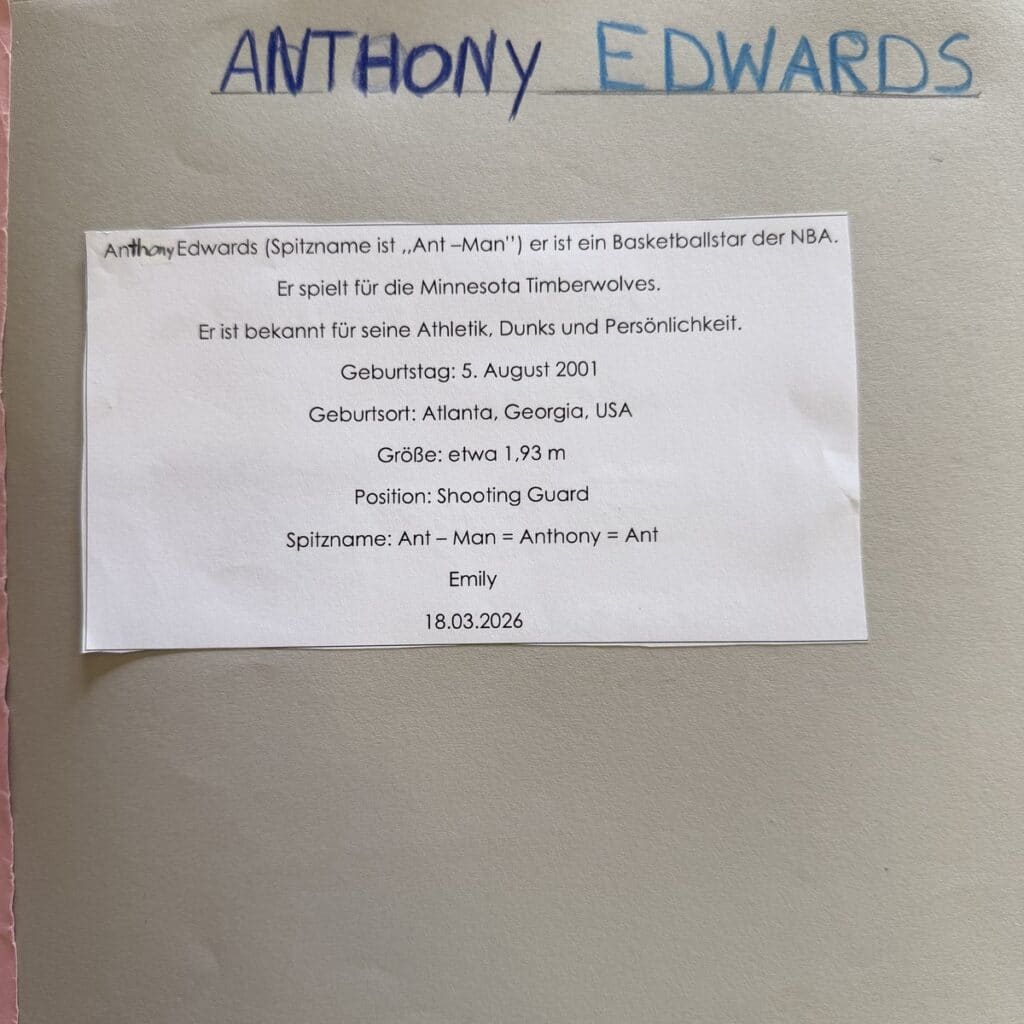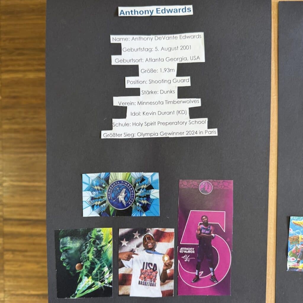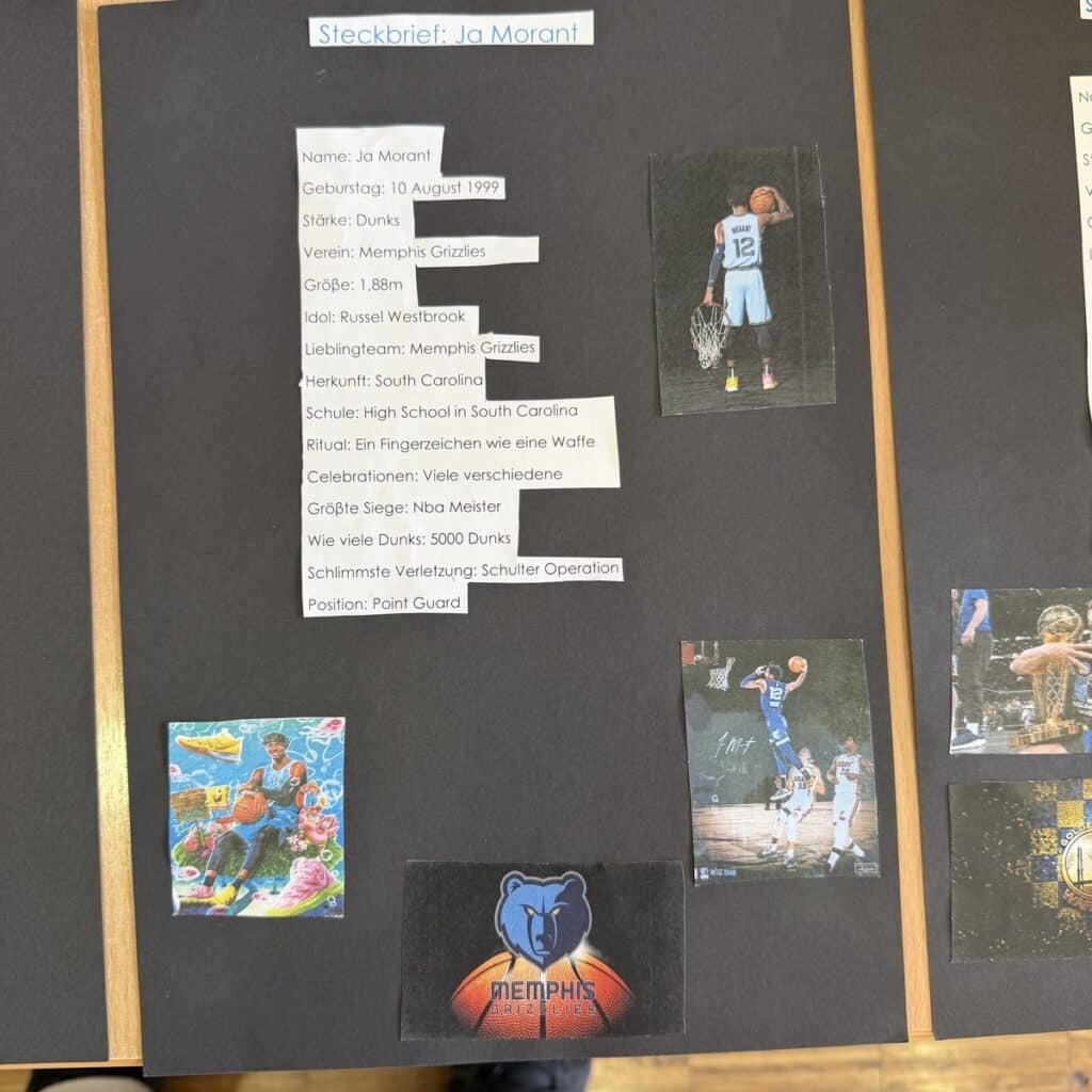 Emily entschied sich, ihren Leporello zum Thema Basketball zu gestalten, da sie selbst begeistert Basketball spielt. Auch Matteo interessiert sich sehr für diesen Sport. Er hatte bereits Steckbriefe über seine Lieblingsspieler erstellt und verfügte somit über Vorwissen. Matteo zeigte seine Steckbriefe. Anhand dieser Steckbriefe fand ein interessanter Austausch über Basketball statt. Matteo unterstützte Emily beim Schreiben und Verbessern ihrer Texte. Er übernahm die Rolle des Experten. Gemeinsam arbeiteten sie am Computer und tippten ihre Inhalte. Aus diesem Austausch entwickelte sich schließlich die Idee, ein gemeinsames Projekt zu gestalten.