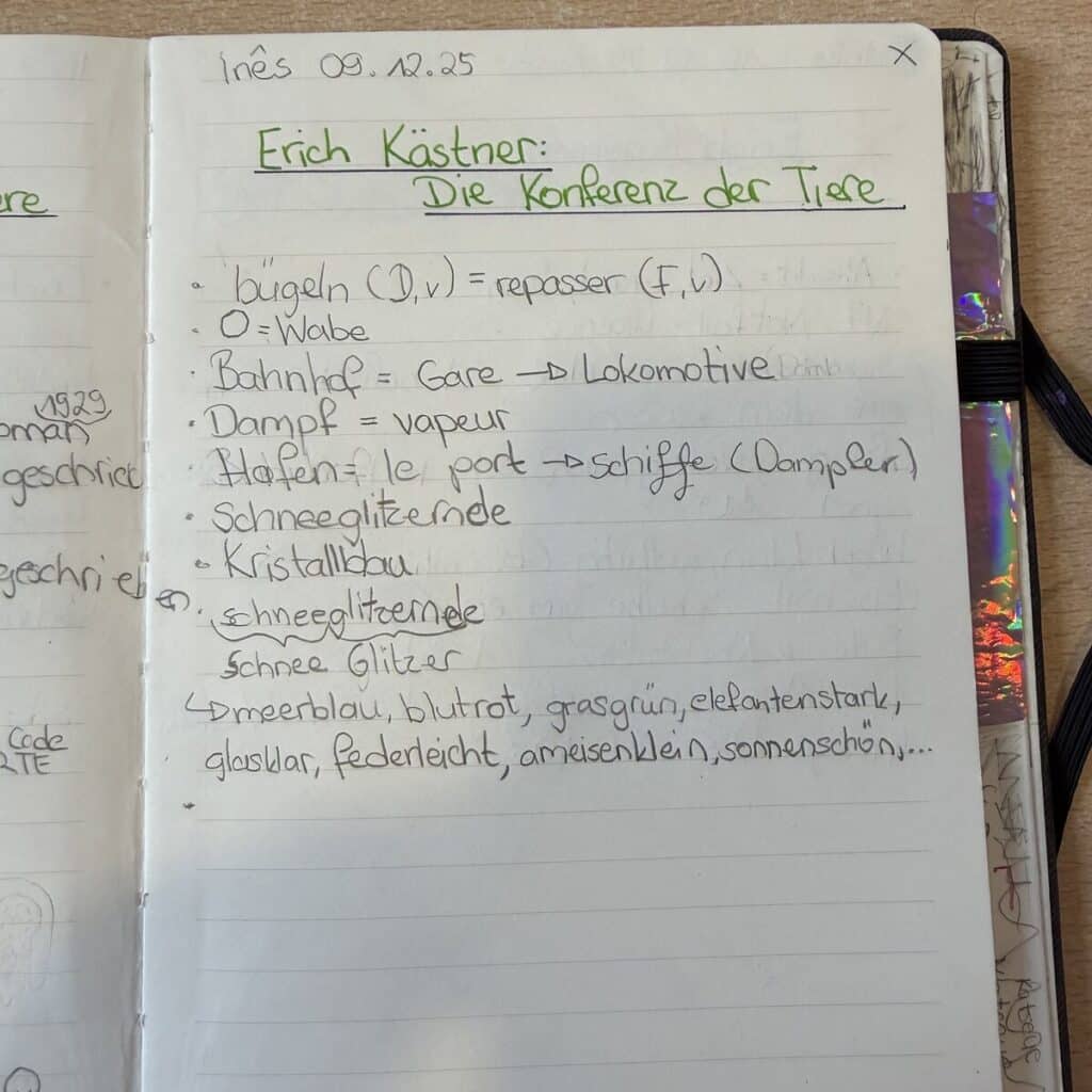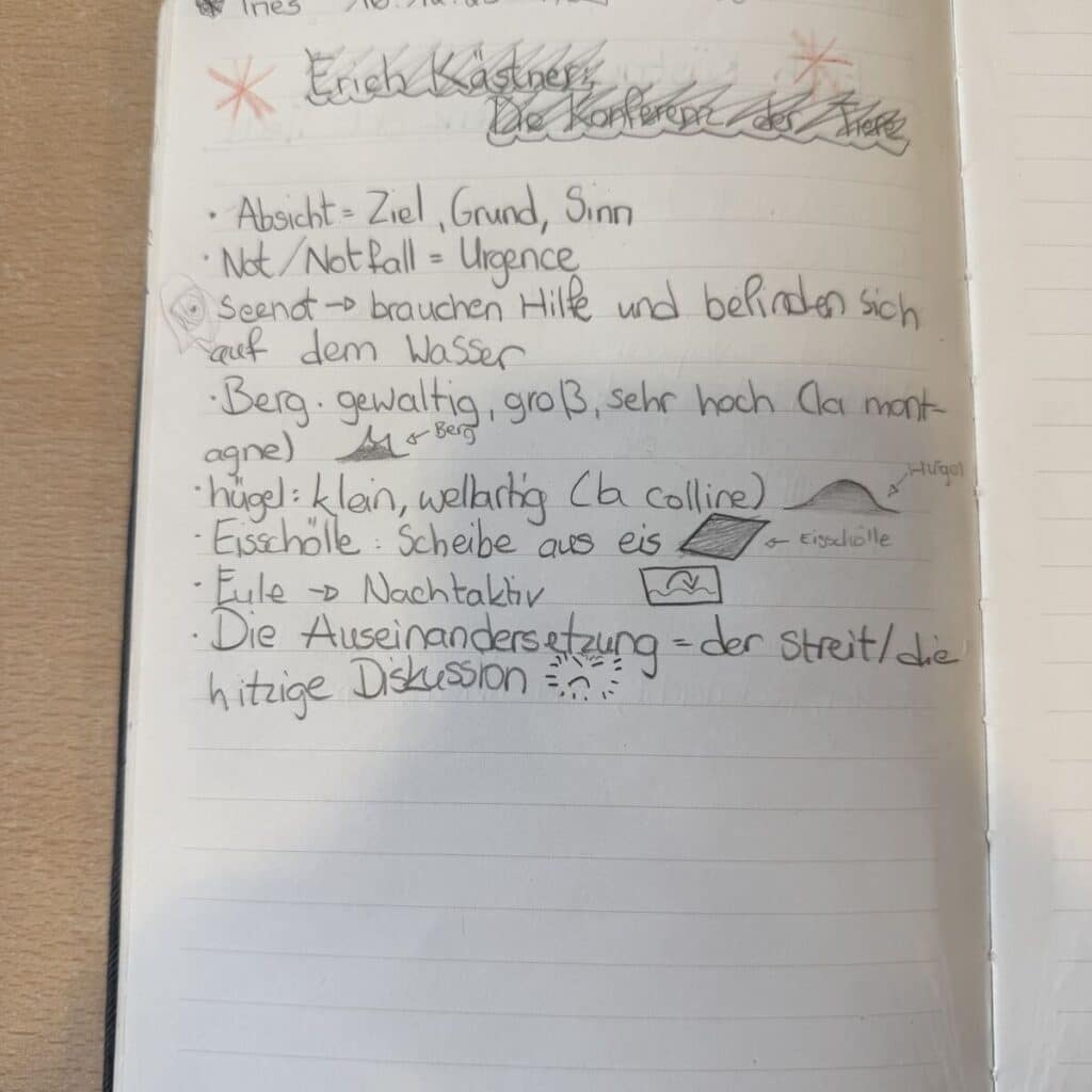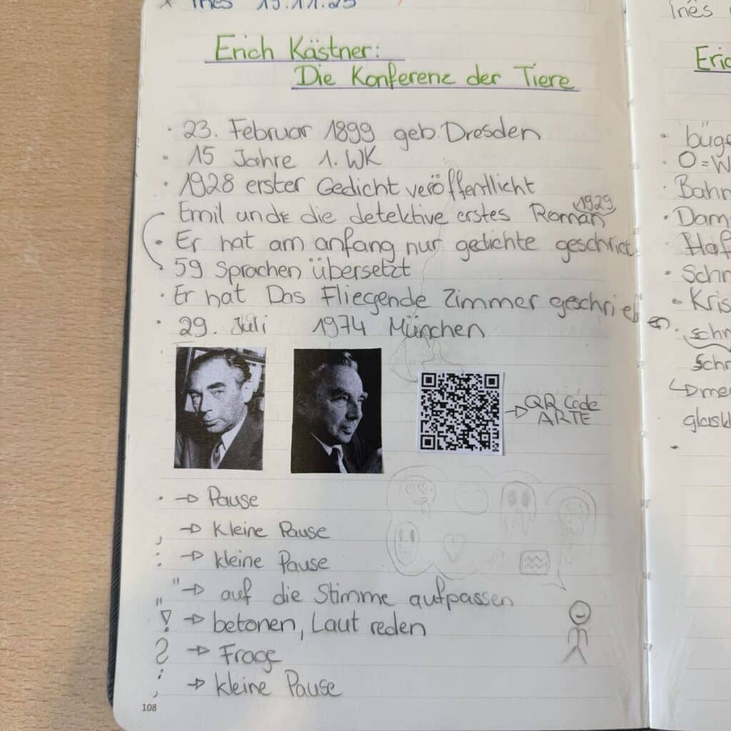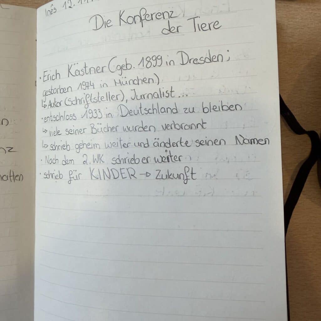 Die Kinder des Zyklus 4 lesen den Roman Die Konferenz der Tiere (1949) von Erich Kästner. Zunächst ging es darum, sich mit dem Autor vertraut zu machen, wie die Kinder es bereits seit dem Zyklus 1 kennen. Kästner entschied sich während des Zweiten Weltkriegs bewusst dafür, in Deutschland zu bleiben, und veröffentlichte seine damals verbotenen Werke weiterhin unter verschiedenen Pseudonymen. (Erich Kästner – ARTE)