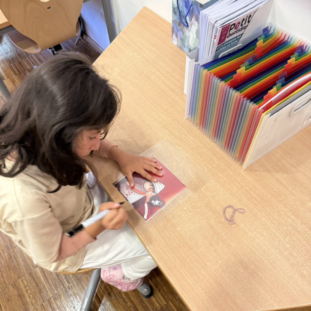 Kyara hat sich für eine Illustration aus dem Buch „Die große Wörterfabrik“ entschieden. Mit großer Sorgfalt hat sie das Bild vergrößert und farblich ausgestaltet. Die Szene zwischen den beiden Figuren, Paul und Marie, hat sie besonders angesprochen. In ihrem begleitenden Text erläutert Kyara, weshalb sie dieses Motiv ausgewählt hat und welche Bedeutung die dargestellte Situation für sie hat. Solche Projekte ermöglichen es den Kindern, ihre kreativen Fähigkeiten zu entwickeln und gleichzeitig ihre persönlichen Gedanken und Gefühle reflektiert zum Ausdruck zu bringen.