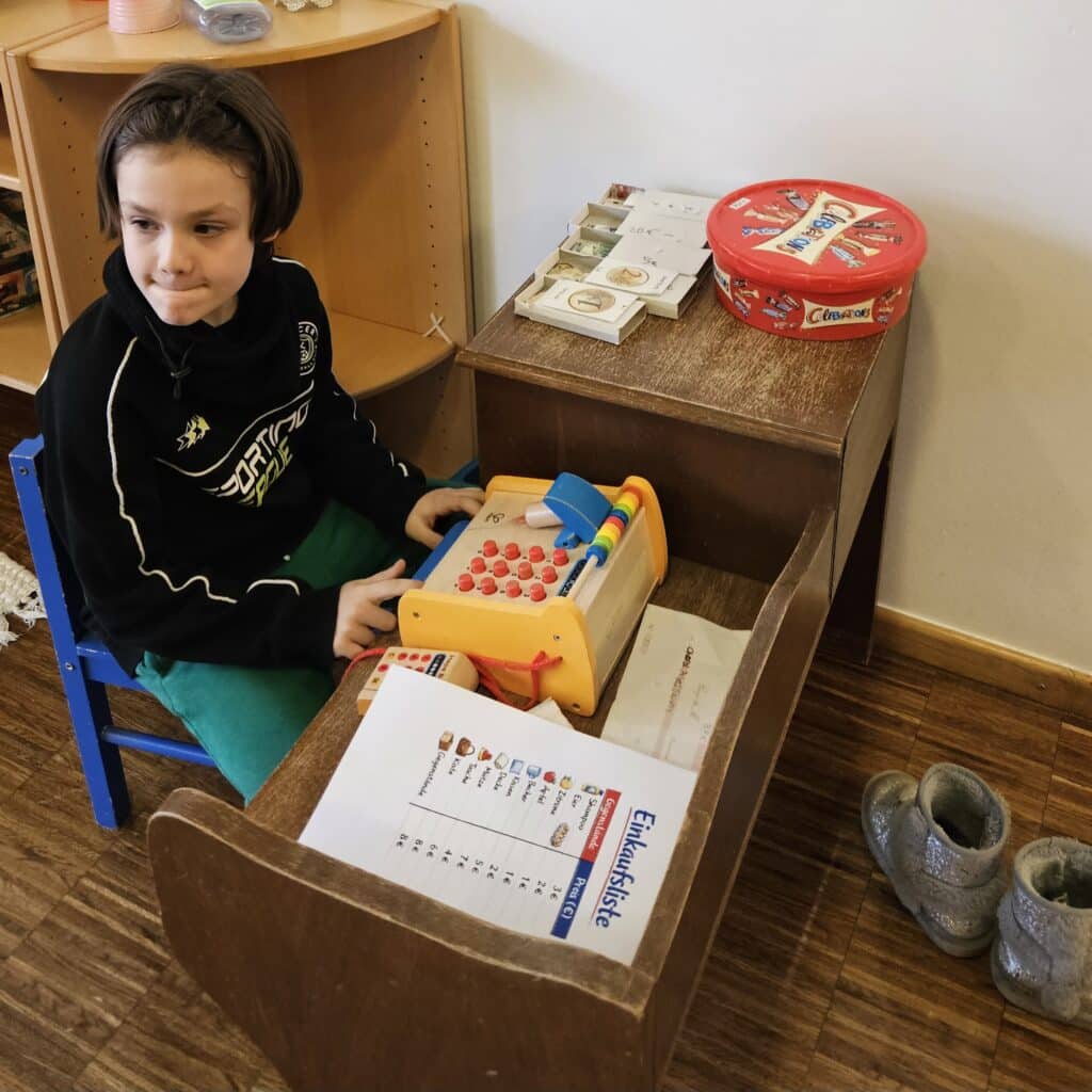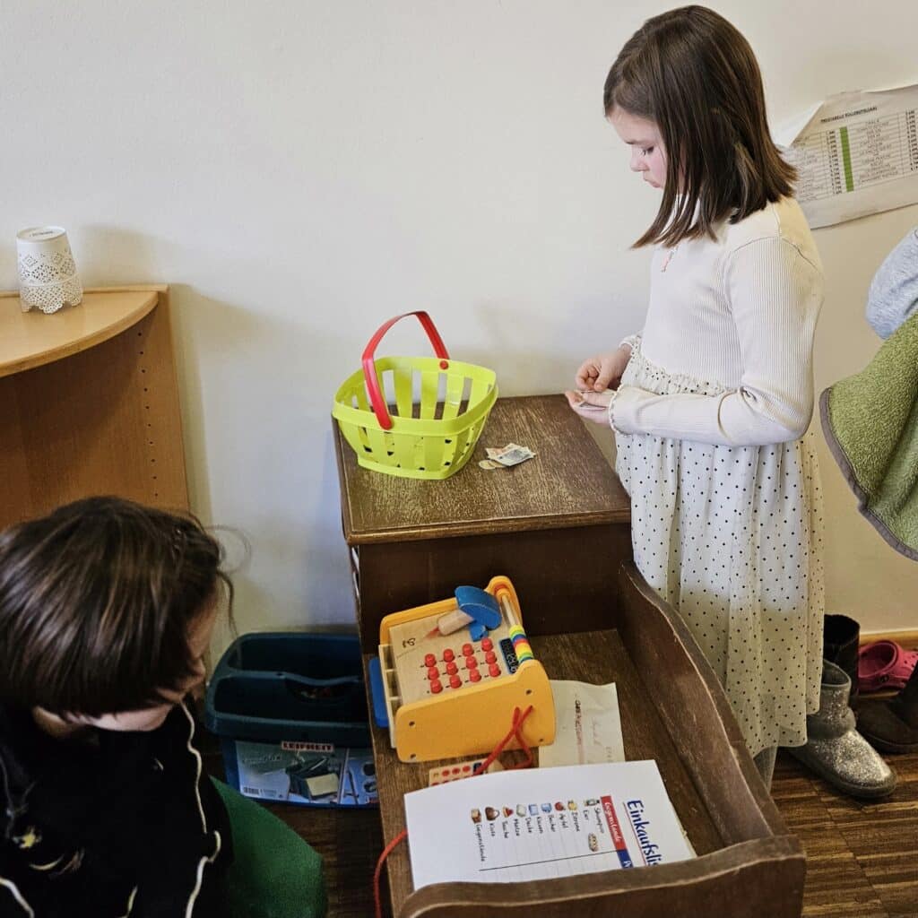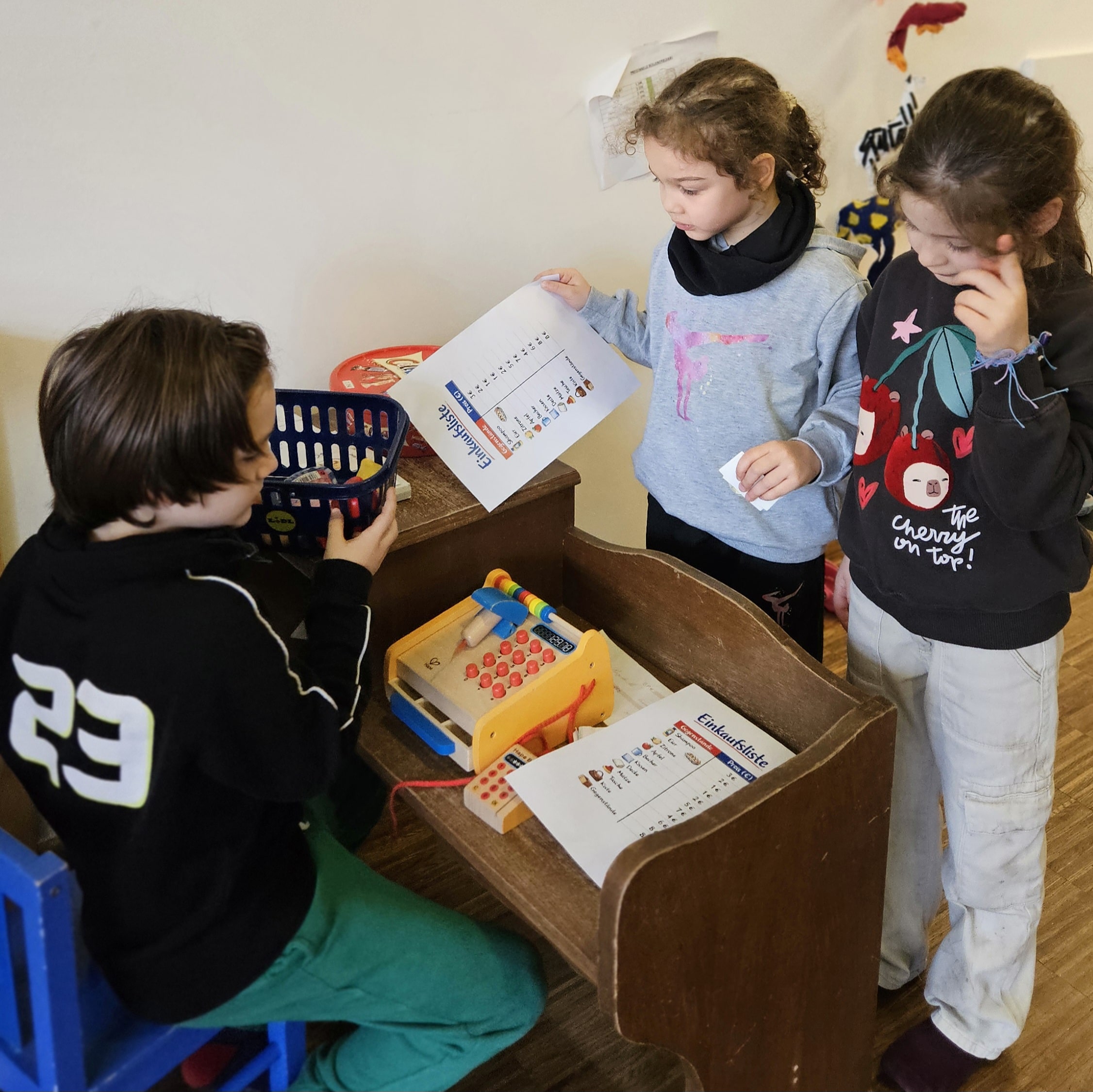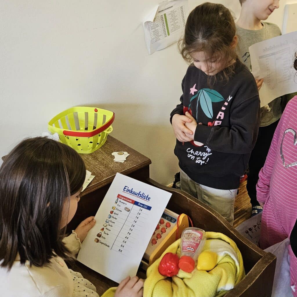 Der Kassierer überprüfte ebenfalls die Rechnung, nahm das Geld entgegen und berechnete das Rückgeld. So konnten die Kinder spielerisch üben, Preise zusammenzurechnen, mit Geld zu bezahlen und den richtigen Betrag zurückzugeben. Die Aktivität ermöglichte es ihnen, mathematische Inhalte in einer realitätsnahen Situation anzuwenden.