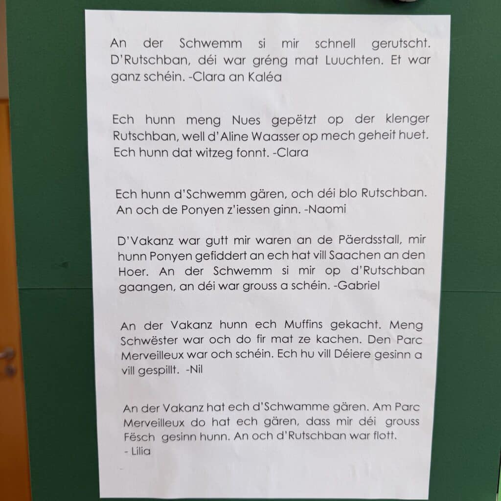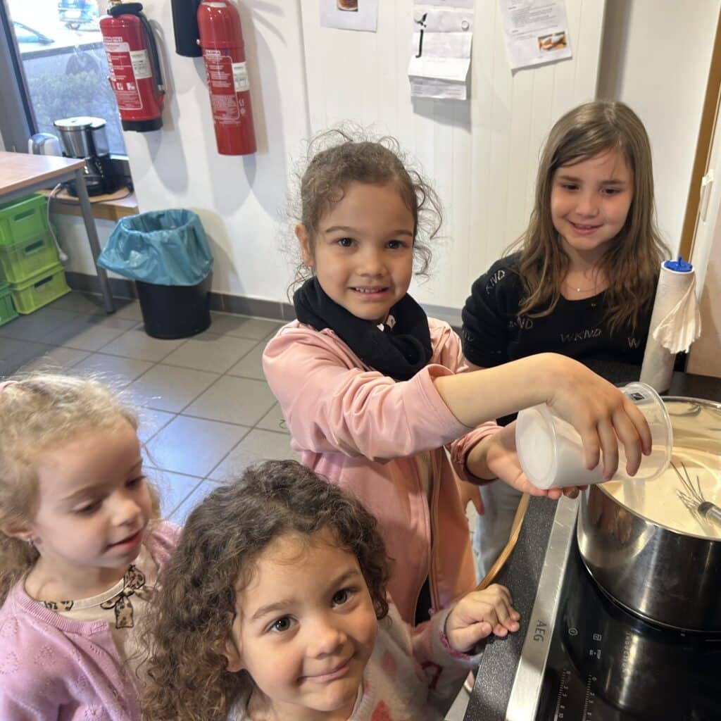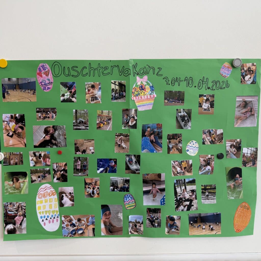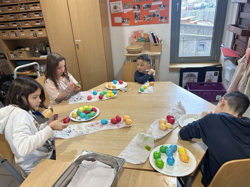 Während der Osterferien hatten die Kinder die Möglichkeit, an zahlreichen abwechslungsreichen Aktivitäten teilzunehmen. Dazu gehörten unter anderem das Bemalen von Ostereiern, sowie eine spannende Ostereiersuche. Darüber hinaus nahmen die Kinder an verschiedenen Ausflügen teil, unter anderem ins Science Center in Differdange, sowie in nahegelegene Parks. Ein besonderes Highlight war ein gemeinsames Kochprojekt: Die Kinder bereiteten ein vollständiges Menü zu, bestehend aus frischen Tagliatelle mit Bolognese-Sauce und einer  Panna Cotta.
