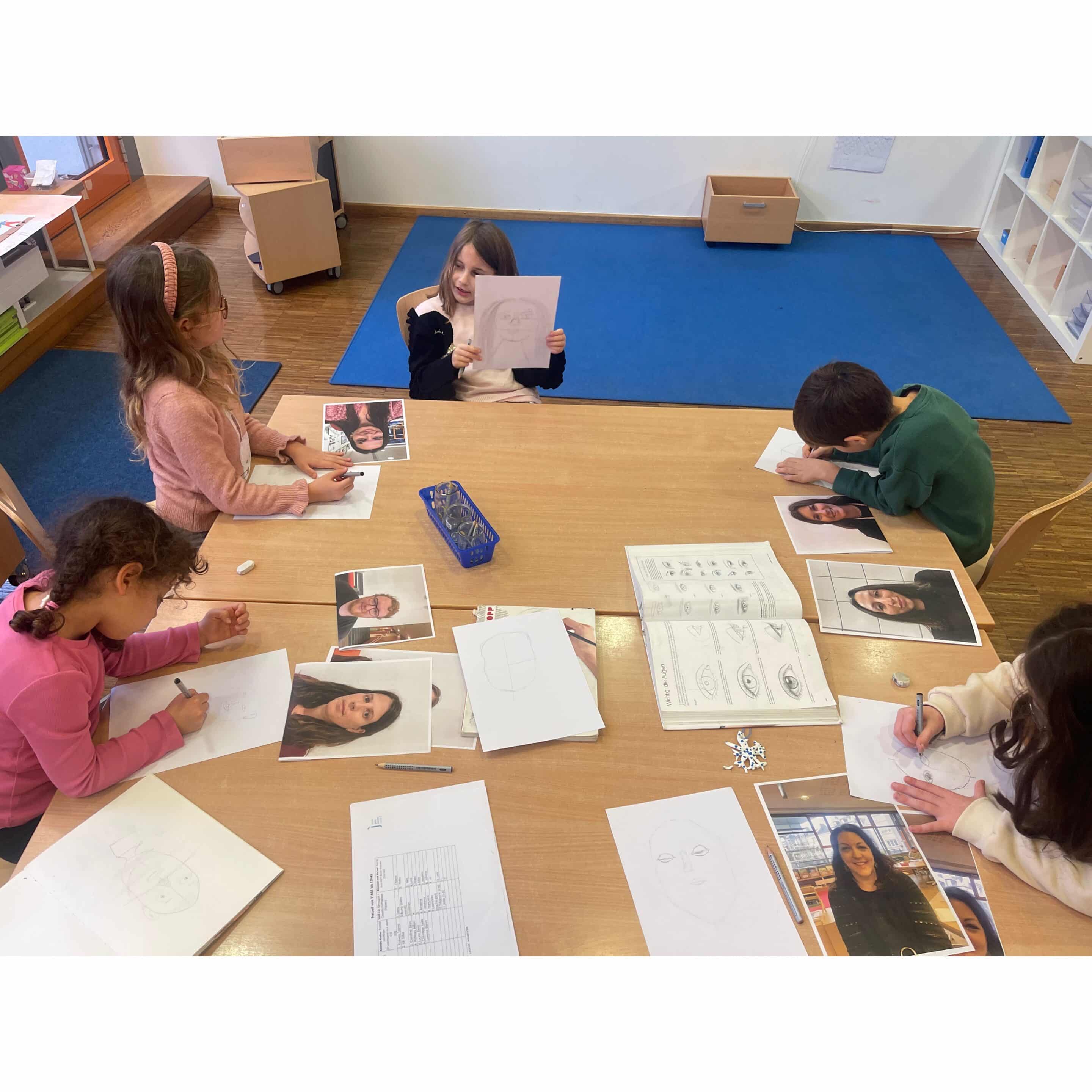 Die Kinder aus dem Zyklus 2 haben die Porträts der Erwachsenen aus demselben Zyklus gezeichnet. Eine besondere Herausforderung bestand darin, die individuellen Unterschiede der Gesichter herauszuarbeiten und die Menschen so darzustellen, dass man sie wiedererkennen kann. Die Kinder haben sich große Mühe gegeben und sich gegenseitig unterstützt.